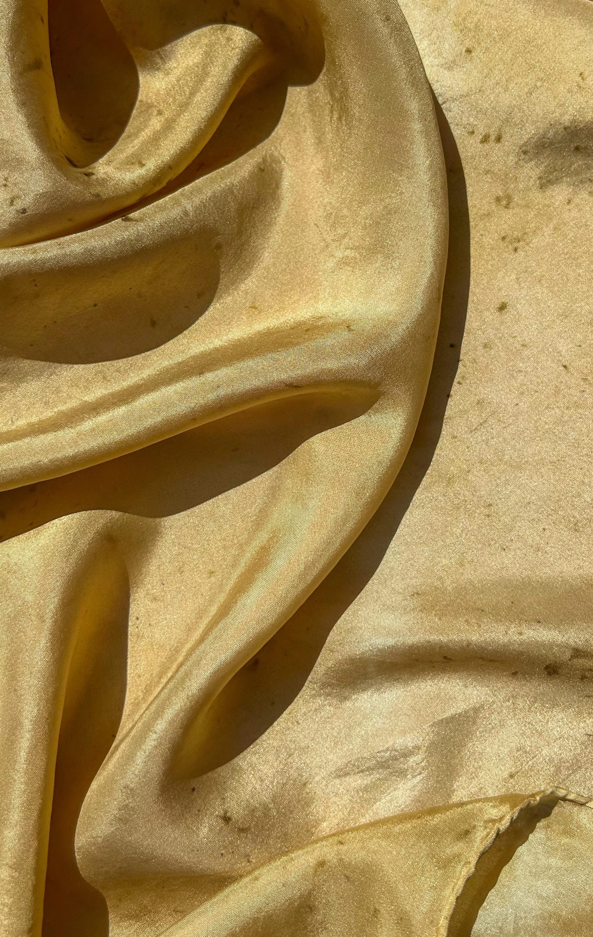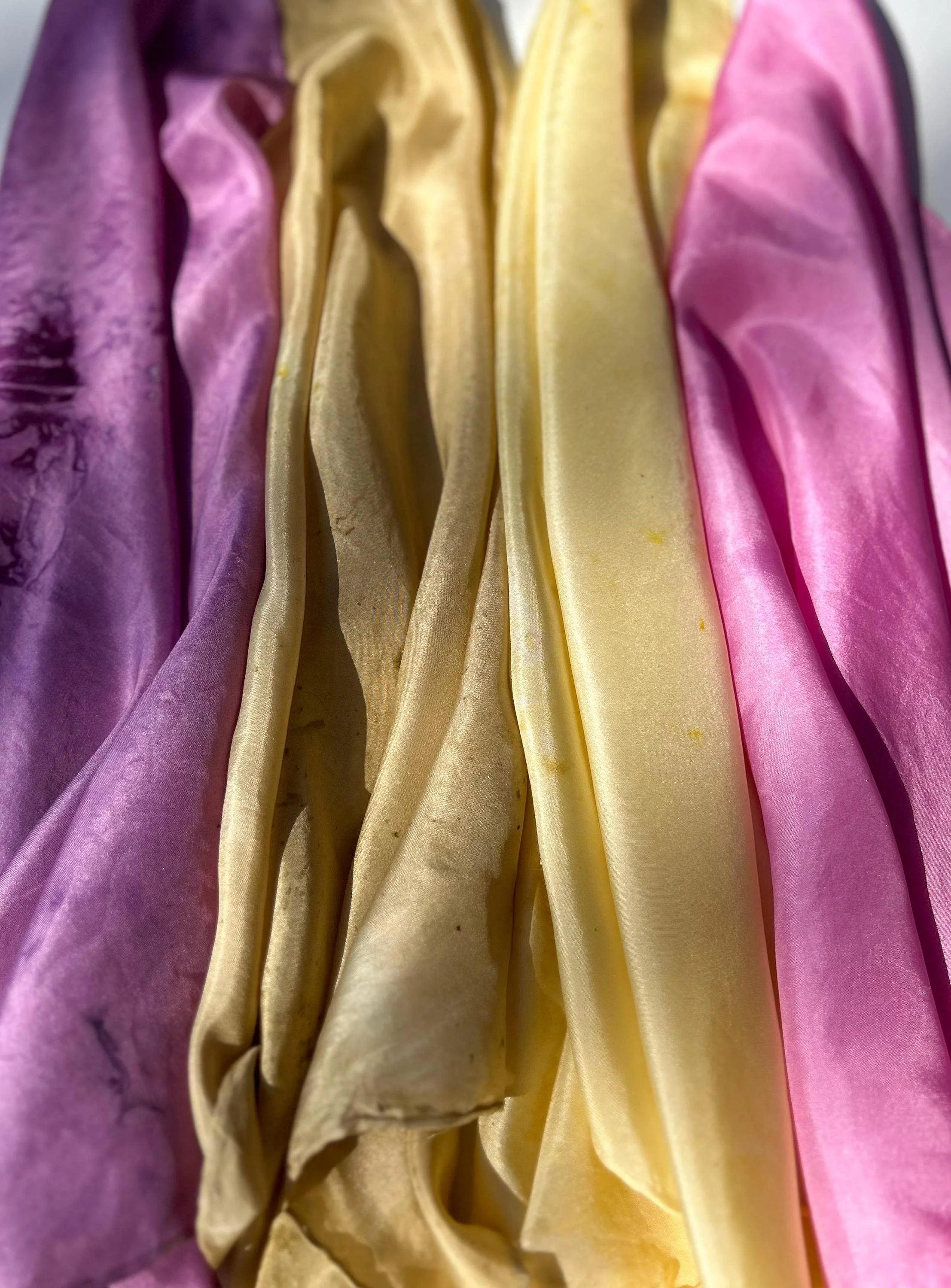 This limited edition set includes a color coordinating set of one silk satin scrunchie and one silk habotai bandana, both naturally hand dyed in small batches using plant-based dyes. Whether styled in your hair, worn as a neck scarf, tied to a bag, or even wrapped around a vase of flowers, this set brings a subtle elegance to everyday rituals.