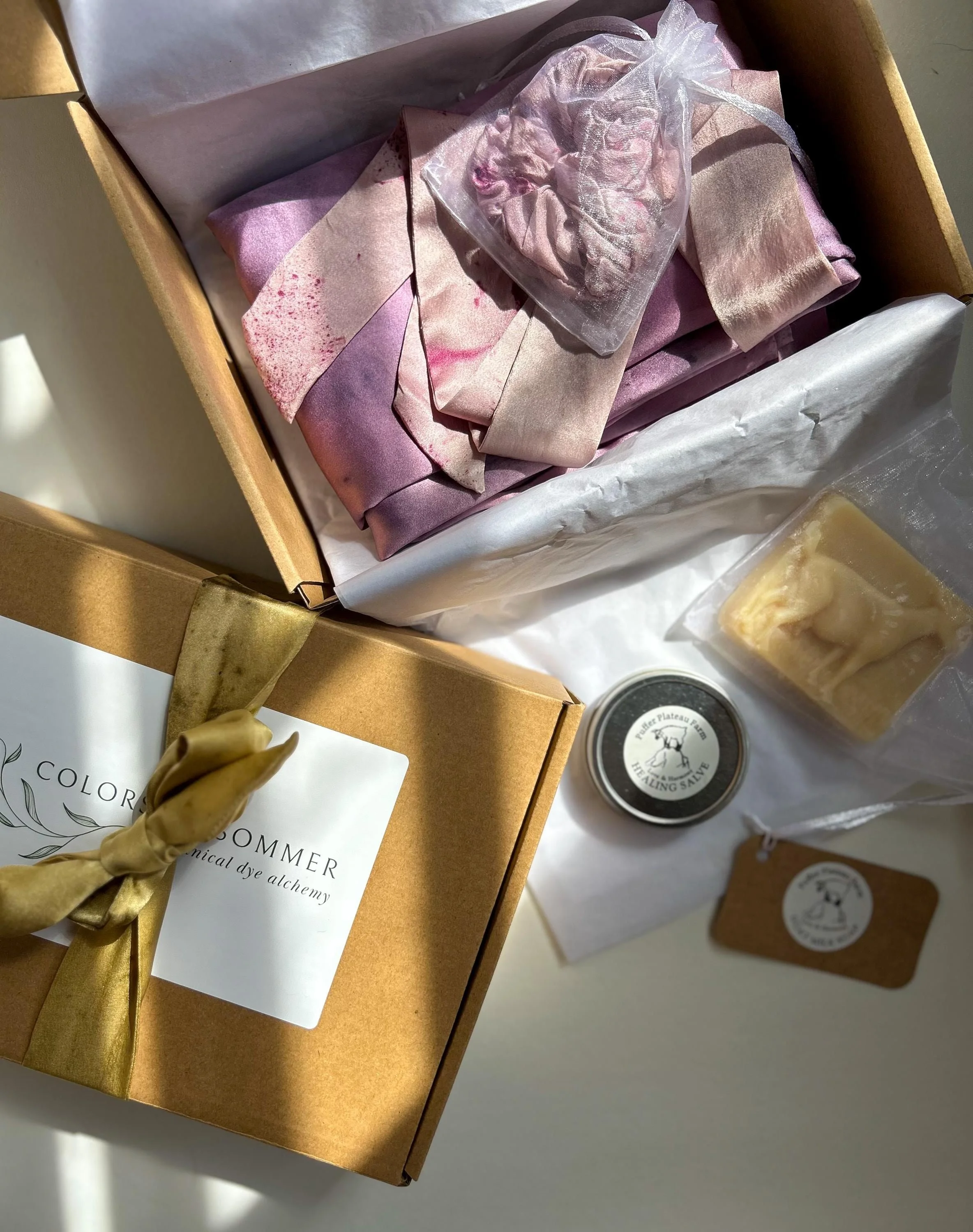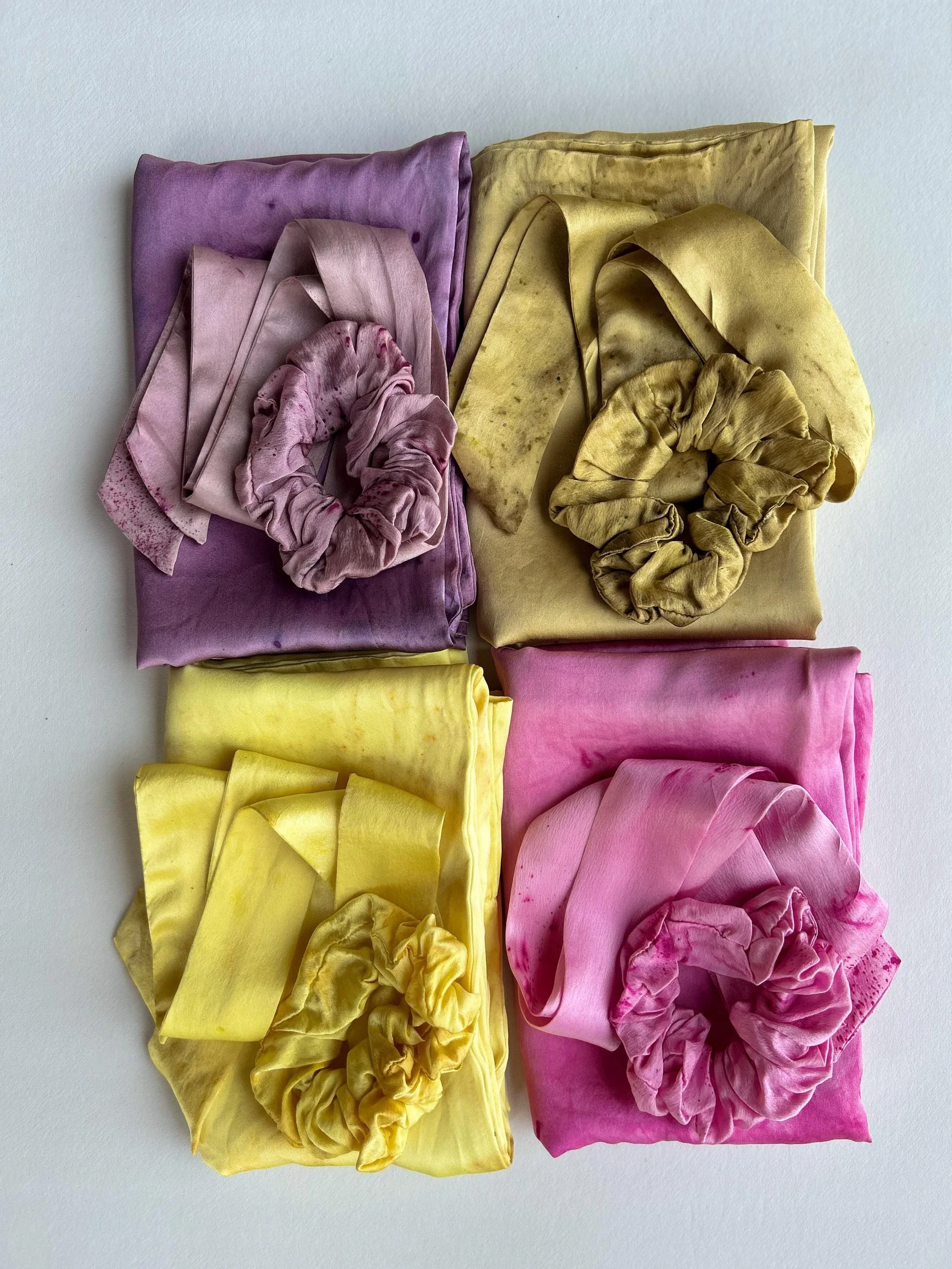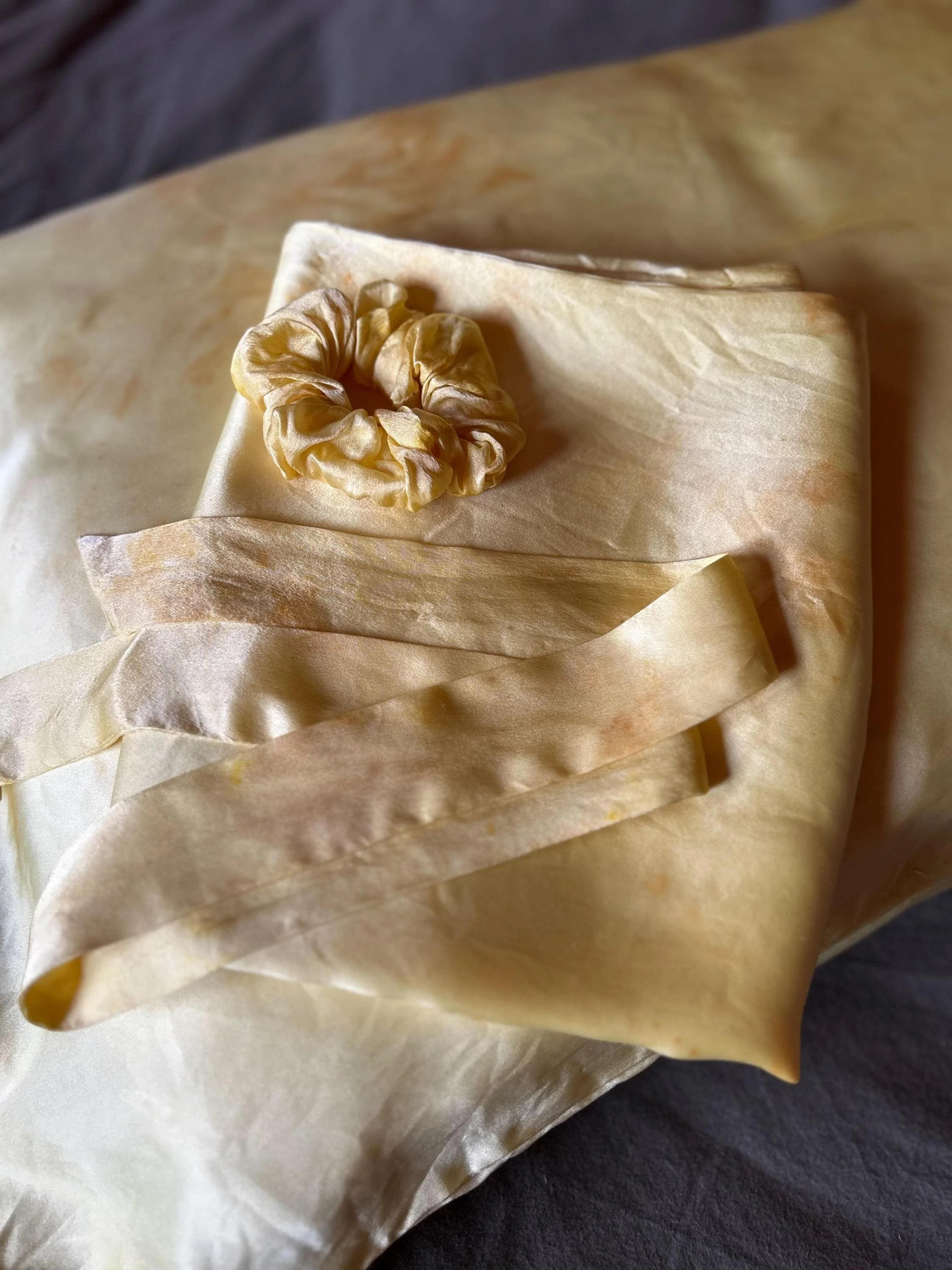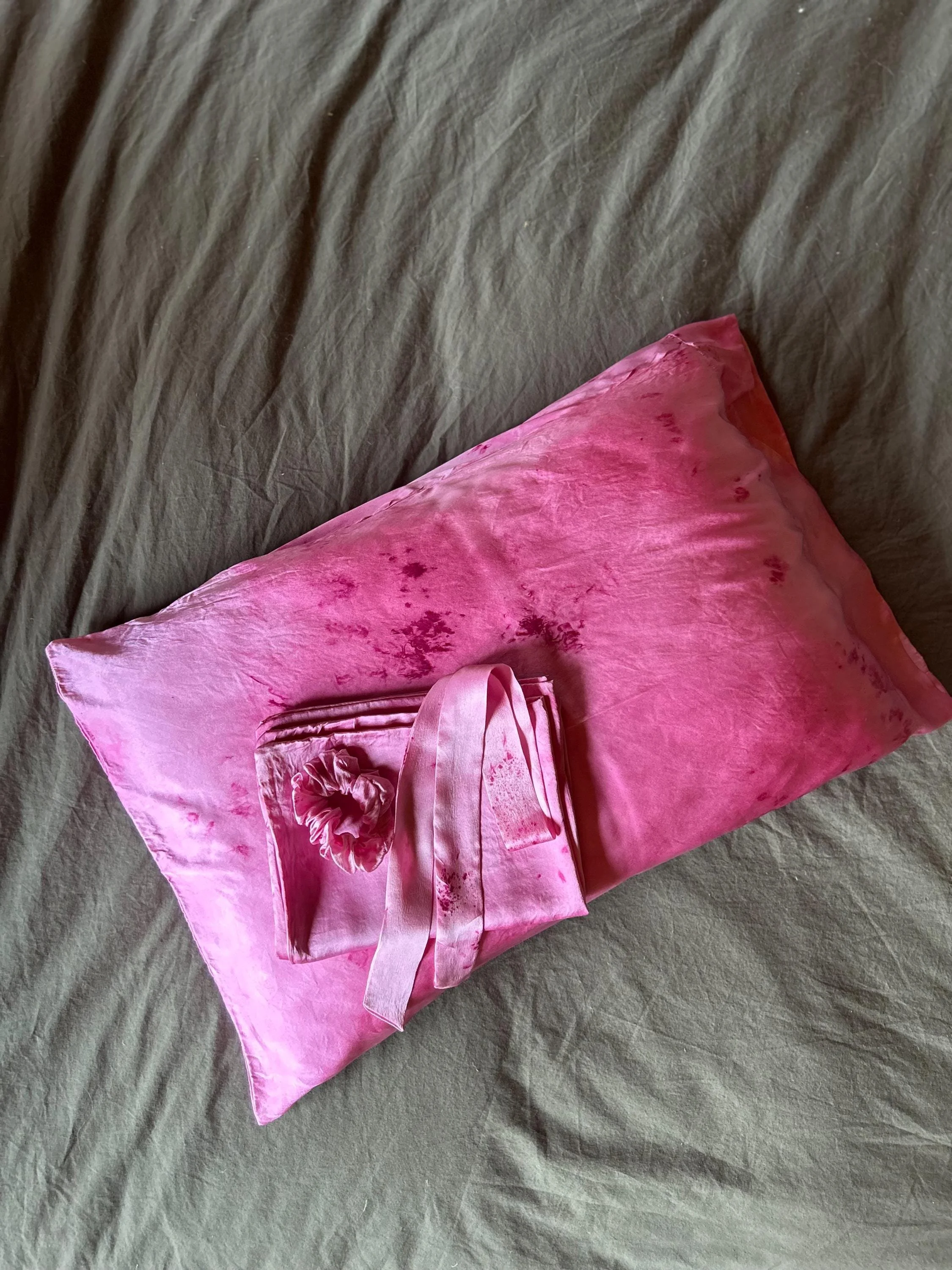 This limited edition bundle includes a color coordinating set of two silk charmeuse pillowcases, one silk satin scrunchie, and one silk ribbon. Each item has been naturally dyed by hand in small batches. A meaningful, thoughtfully curated set designed to bring a touch of luxury to your everyday rituals- from sun up to sun down, for years to come.